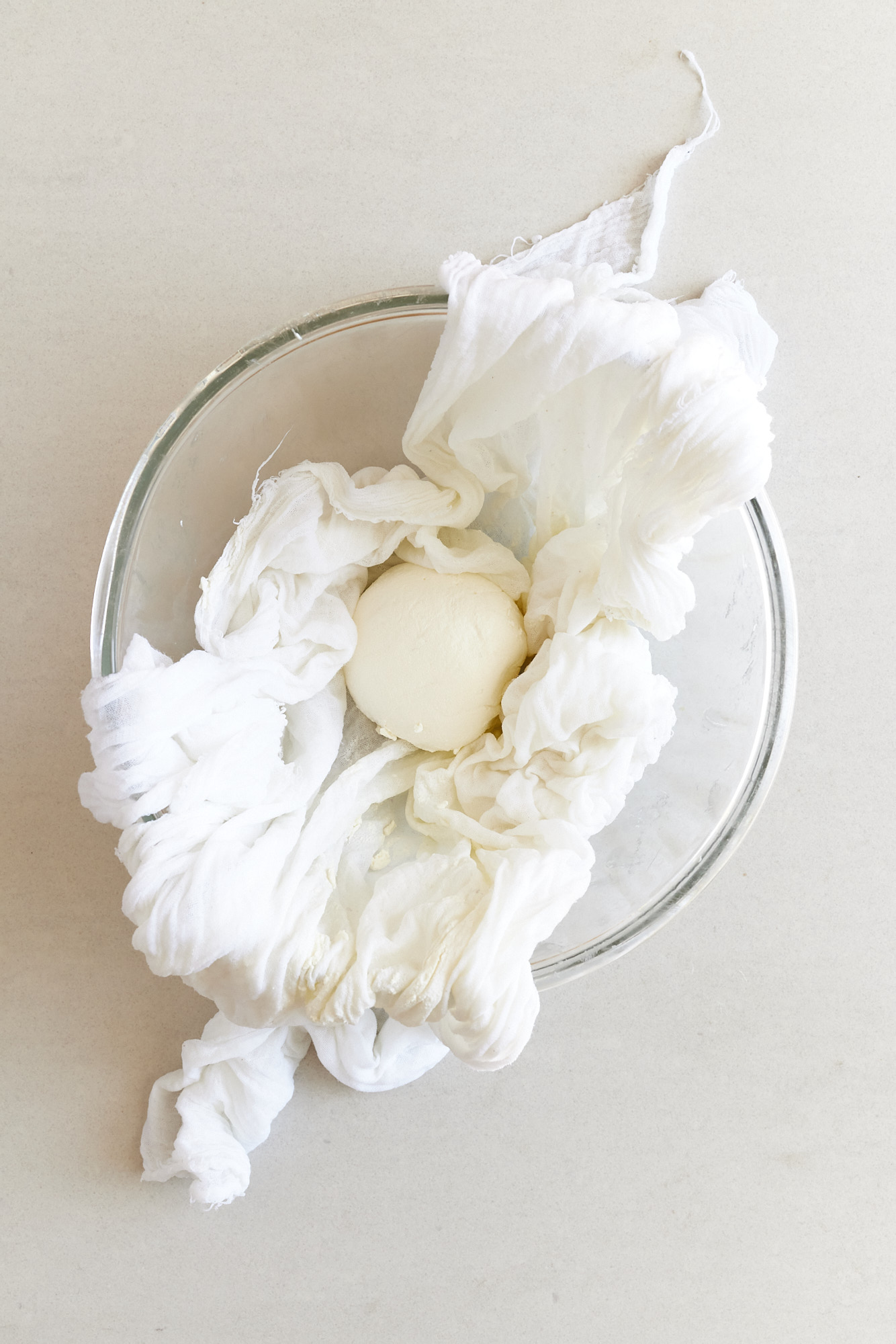 The next morning, unravel your muslin and you should have a nice, round ball of thickened labneh.