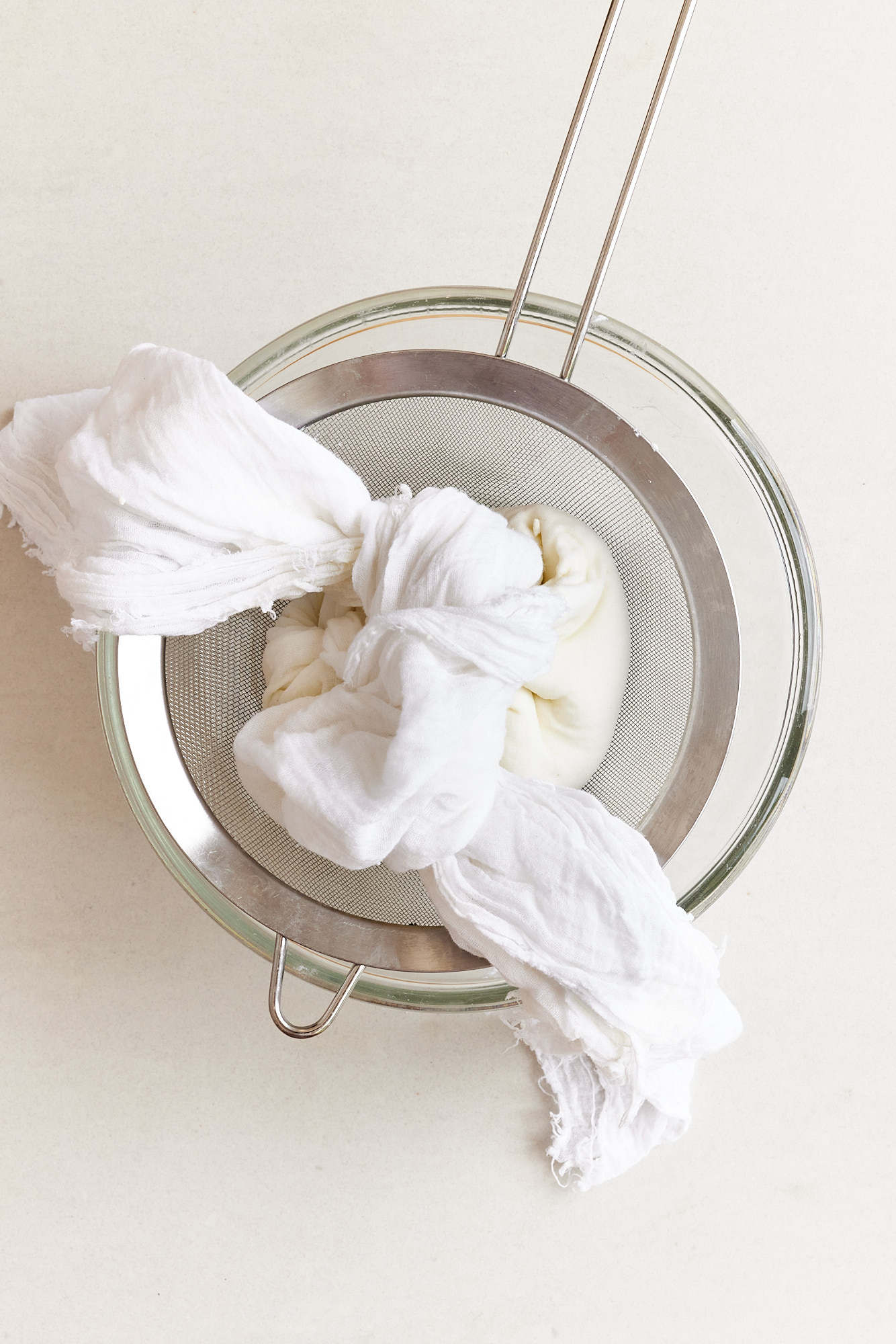 Line your sieve with muslin or a cheese cloth. You can get hold of these quite easily online or from a good food or cookware shop. If it’s quite a big piece of fabric you can fold and double up on the layers.