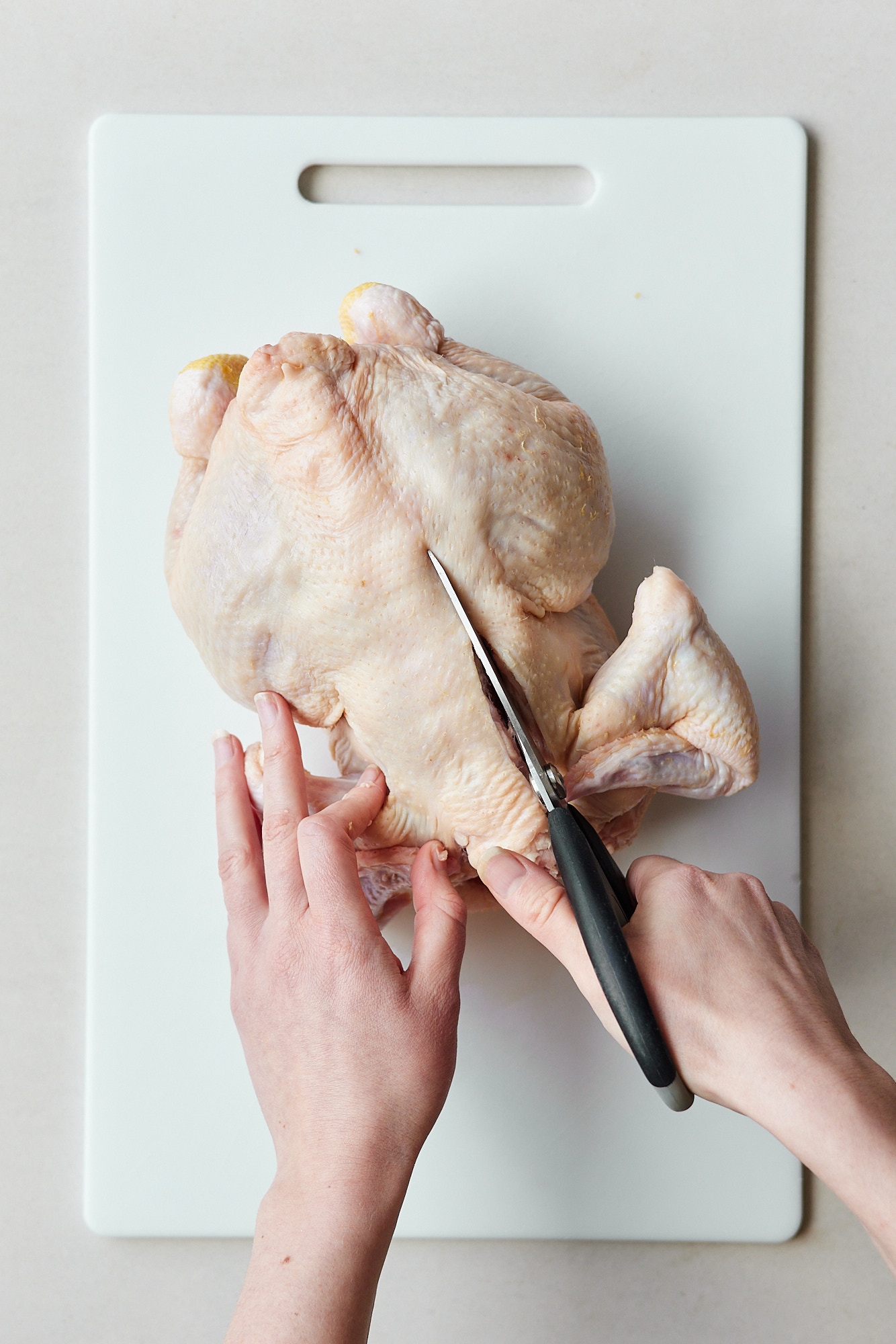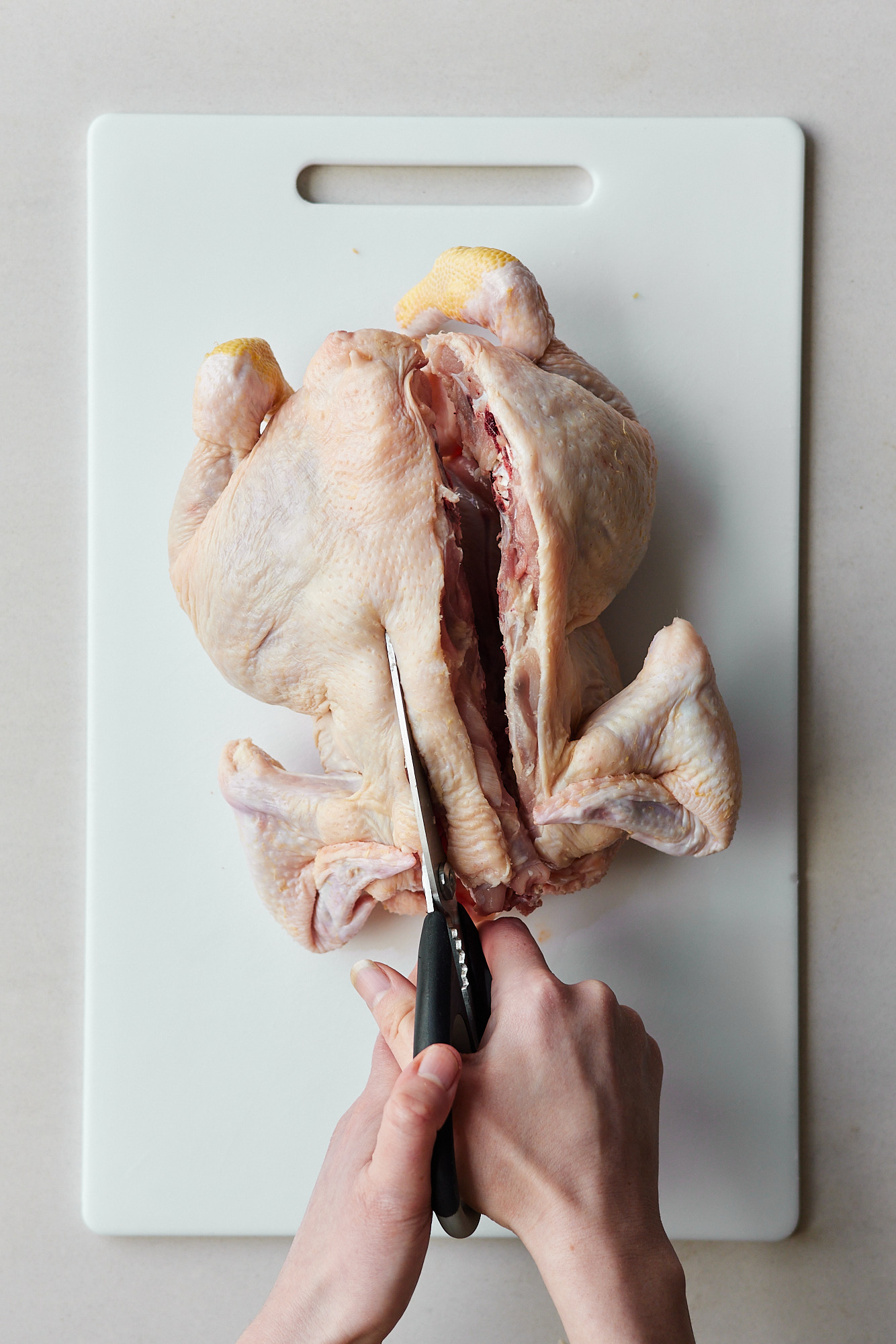 Locate the backbone of the chicken with your fingers. Using a strong pair of kitchen scissors, carefully cut along one side of the backbone, all the way from top to bottom. Repeat, cutting along the other side of the backbone.