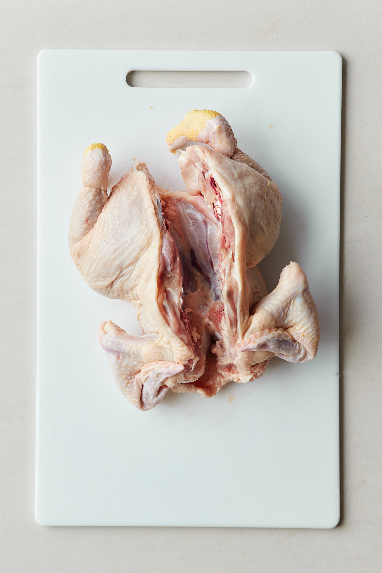 Carefully remove the bone you have just cut loose, open up the chicken a little and flip over.
