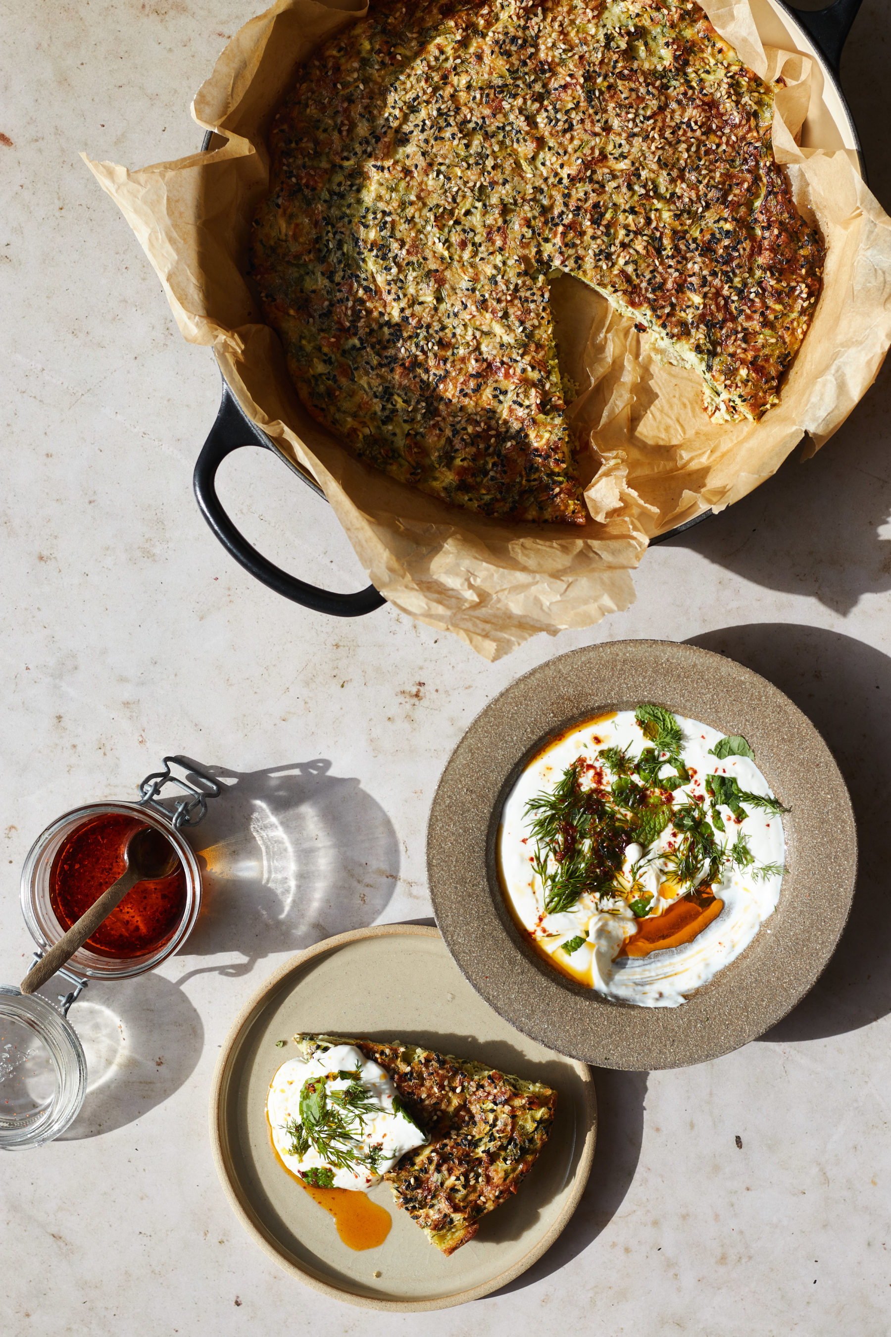 Take the pan out of the oven and carefully pour in the courgette mix. Sprinkle some sesame and nigella seeds over the top and bake in the oven for 35 minutes.