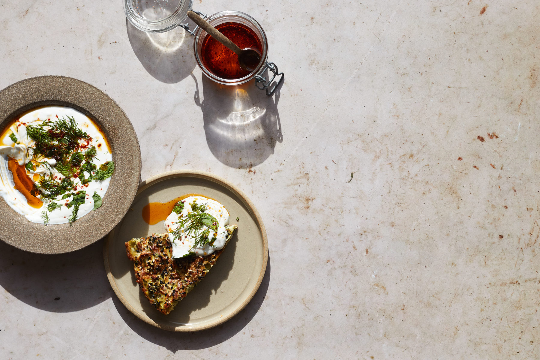 While it’s resting make your garlic yoghurt. Crush your garlic in a pestle and mortar with some salt. Add in the yoghurt and a squeeze of lemon juice and mix again. Top with some roughly chopped soft herbs like mint and dill, toasted pine nuts and a little chilli oil or olive oil.