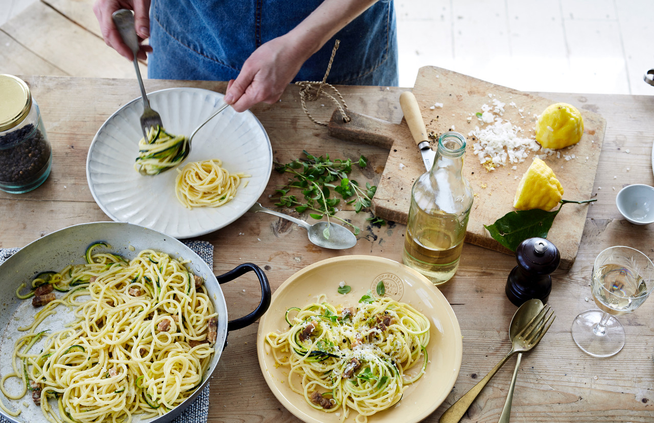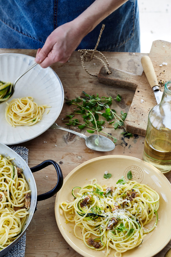 One of the things I wholeheartedly admire about Italian cooking is its absolute disdain for messing with the classics, so I do feel a little guilty for sneaking fine threads of courgette into this spaghetti dish. There are a few rules I strictly abide by when cooking pasta, however. Heavily salting the pan of water is essential to have properly seasoned pasta – it should be as salty as the sea. Starch is your friend – it will emulsify the sauce, so you don’t want to rinse the pasta after cooking, and for the same reason you should always scoop a mugful of water from your pan of cooking water before draining so that it can be added later. Once you’ve drained your pasta, return it to the pan with extra fat (butter, olive oil or bone marrow) and as much reserved pasta water as is required to loosen it, then and coat it in the sauce by tossing.