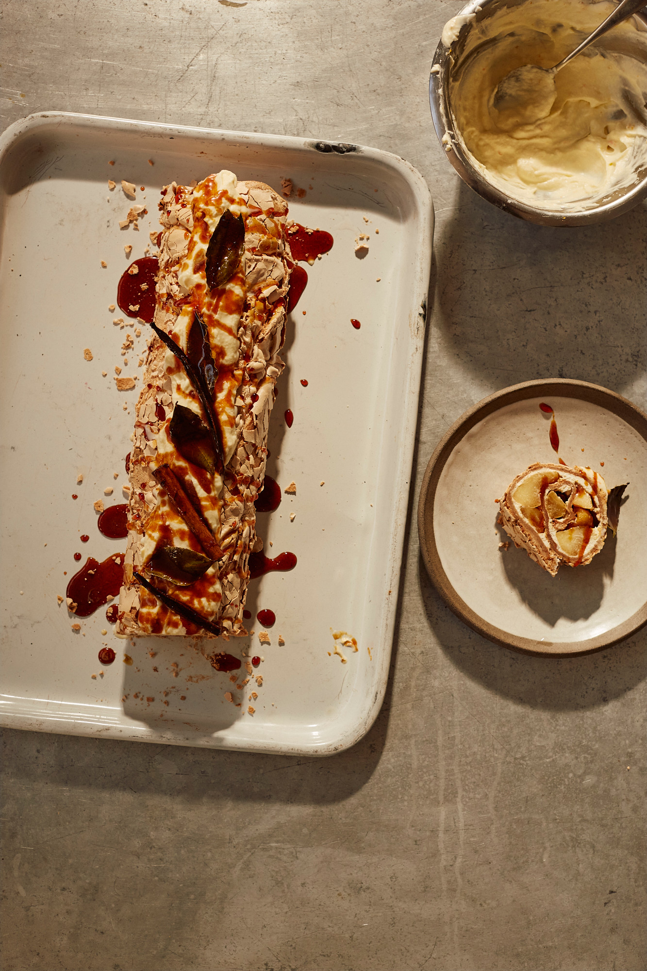 Brown Sugar Meringue Roulade with Burnt Honey Apples