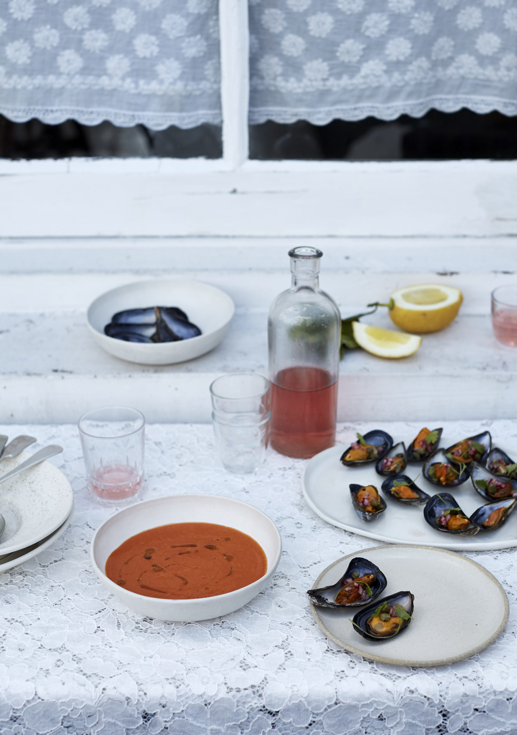 Put the red wine vinegar, sugar and a pinch of salt into a small cup or glass and stir to dissolve then mix in the red onion. Drizzle over the mussels then dot with the capers and coriander leaves and add a good squeeze of lemon juice. Ladle the chilled soup into bowls and add a swirl of olive oil. Spoon up the soup with the mussel scoopers, getting a mouthful of everything all at once.