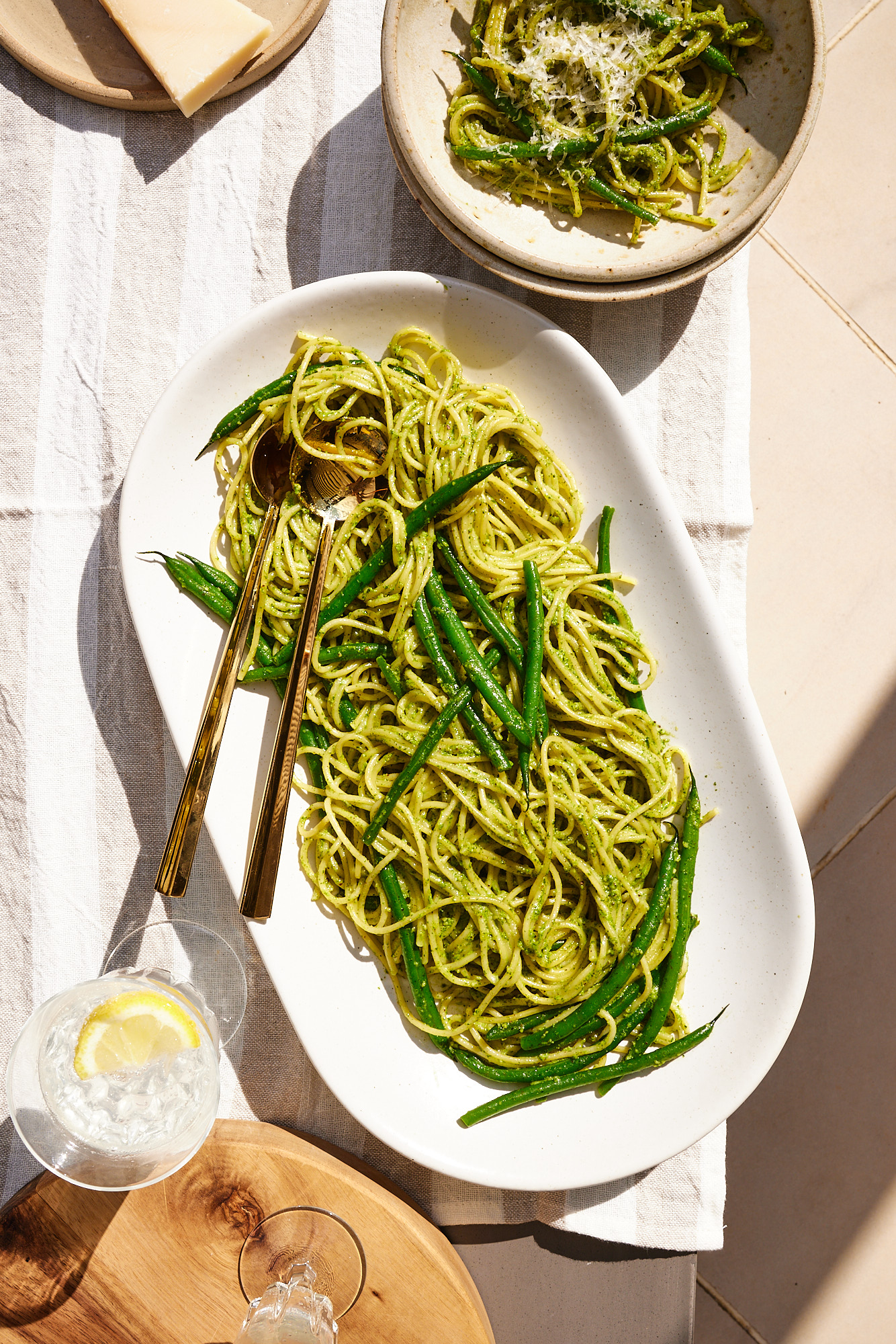 A classic pesto is delicious, but try it with peppery rocket and deep hazelnuts through lots of spaghetti. The green beans add a lightness and make it even more perfect for the season.